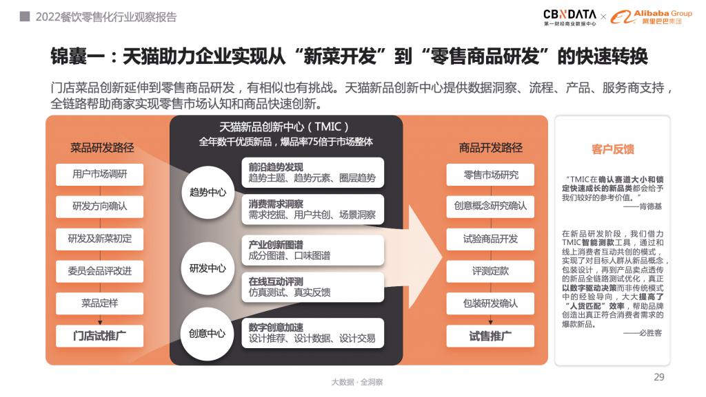 以選品為例,天貓新品創新中心(TMIC)聚焦趨勢中心、研發中心、創意中心等三大職能部門,可為餐企提供數據洞察、流程、產品、服務商等新品開發全鏈路支持。