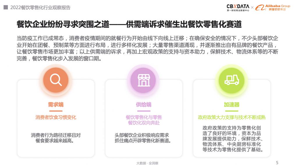 《報告》指出,近年來農村農業部、國家發改委,以及廣東省、河南省先后出臺鼓勵支持預制菜發展的政策,為產業健康發展創造良好環境。與此同時,2021 年 " 餐飲零售 " 領域獲得超 50 億的新融資。政策利好與資本擁躉的 " 雙輪驅動 " 下,行業迎來快速發展期。不少頭部餐飲企業看準消費趨勢,步入零售賽道。