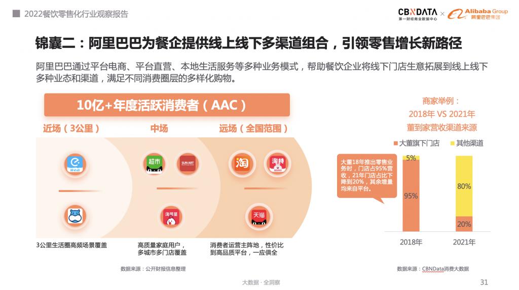 這一點,大董烤鴨深有體會。以大董旗下零售品牌董到家為例,2018 年,大董推出零售業務時,門店占比 95%營收。2021 年,大董門店占比下降至 20%,其余 80%均來自于其他渠道,其中天貓等主流線上電商營收占比約 60%。