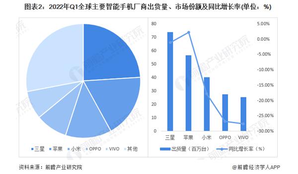 據前瞻產業研究院報告指出,2022 年一季度全球智能手機市場需求疲軟。具體來看,第一季度出貨量排名前五的品牌分別為三星、蘋果、小米、OPPO 和 VIVO,其中三星和蘋果第一季度出貨量分別占總出貨量的 24% 和 18%; 出貨量前五的企業中,除蘋果的出貨量實現了同比正增長之外,其他品牌出貨量都出現了下滑,其中 VIVO 第一季度出貨量同比下滑了 27.7%。