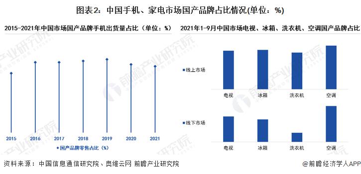 根據中國信息通信研究院和奧維云網統計數據,中國手機和家電市場中,國產品牌均占據了大多數的市場份額。2015-2021 年中國市場國產品牌手機出貨量占比均在 82% 以上 ;2021 年 1-9 月,無論是線上市場還是線下市場,電視、冰箱、洗衣機、空調國產品牌占比均在 76% 以上。