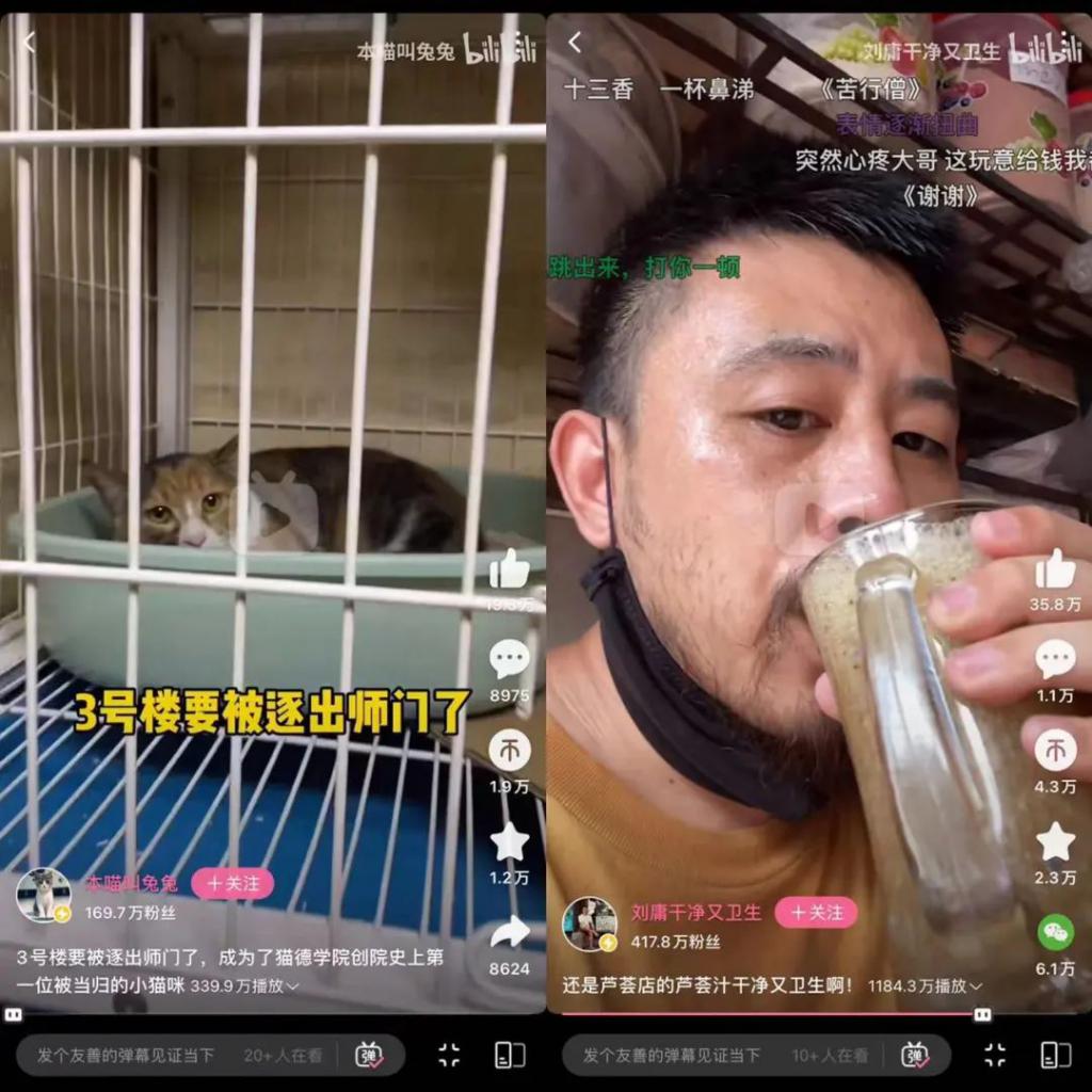 同時,我也沒有刷到太多來自 B 站大 UP 主(尤其是百大 UP 主)的豎屏內容,里面比較特別的是 @本喵叫兔兔 和 @劉墉干凈又衛生,這是近兩年在 B 站和抖音等平臺快速成長起來的短視頻 UP 主,以簡單小故事和非常有記憶點的口頭禪打入觀眾,成為了互聯網文化的一部分。比如,現在看到不乖的野貓,大家都會叫它 " 三號樓 ",就是來自于 @本喵叫兔兔。