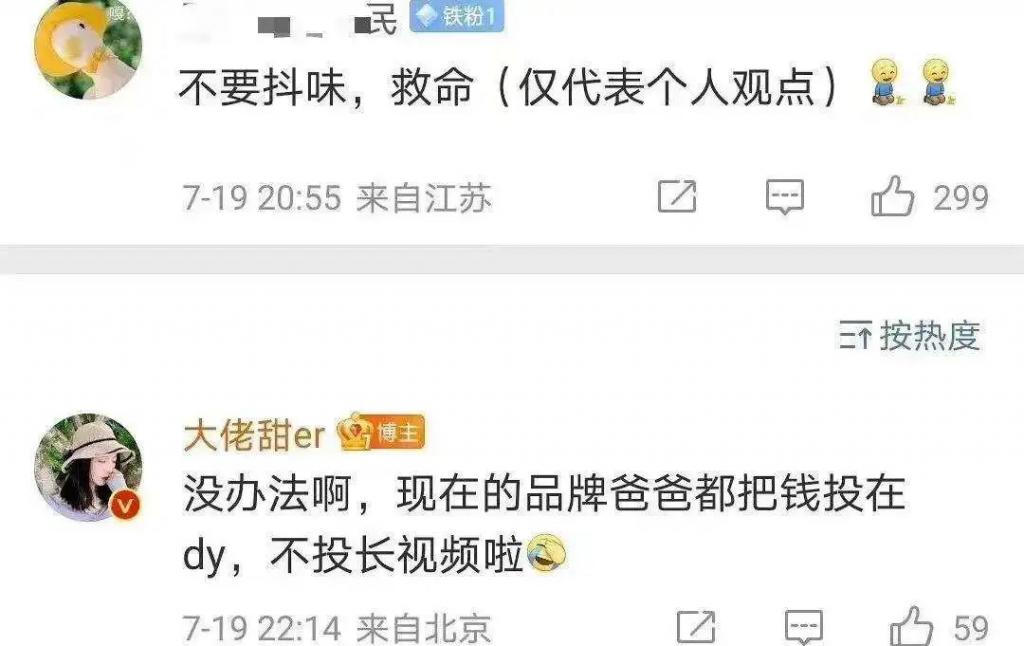 在 B 站上擁有 147 萬粉絲的 UP 主 " 大佬甜 er",最近收到了很多老粉吐槽,希望她能夠多出她們之前喜愛的,逐步教化妝的長視頻,少出 " dy 化 " 的短視頻。大佬甜 er 顯然比較無奈,回復稱," 沒辦法啊,現在的品牌爸爸都把錢投在 dy(抖音),不投長視頻啦。"