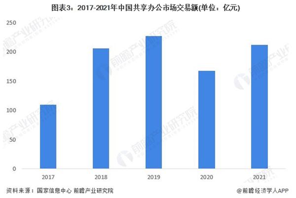 共享辦公,又叫做柔性辦公、短租辦公、聯合辦公空間,也被稱為創客空間或眾創空間,脫胎于美國 "WeWork" 的共享式辦公室,是一種為降低辦公室租賃成本而進行共享辦公空間的辦公模式。近年來共享辦公發展較快,2019 年市場規模達到 227 億元,2020 年受疫情影響企業停工停產,共享辦公市場有所下滑。后疫情時代,隨著辦公需求大幅回流,以及靈活辦公模式的興起,推動了共享辦公市場快速回暖,2021 年我國共享辦公市場規模達到 212 億元。