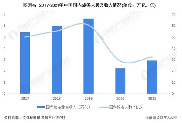 疫情沖擊下,國內旅游業受到重創,2020 年我國國內旅游人數和旅游收入大幅下滑,2021 年國內旅游市場復蘇緩慢,旅游人數和旅游收入雖然較 2020 年有所上漲,但僅為 2019 年的一半左右。