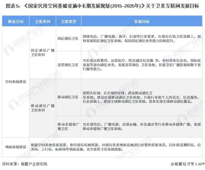 根據《國家民用空間基礎設施中長期發展規劃 ( 2015 — 2025 年 ) 》制定的發展目標," 十四五 " 時期要構建衛星遙感、通信廣播和導航定位三大系統。其中,在衛星通信廣播系統方面,面向行業及市場應用,以商業化模式為主,保障公益性發展需求,主要發展固定通信廣播衛星和移動通信廣播衛星,同步建設測控站、信關站、上行站、標校場等地面設施,形成寬帶通信、固定通信、電視直播、移動通信、移動多媒體廣播業務服務能力,逐步建成覆蓋全球主要地區、與地面通信網絡融合的衛星通信廣播系統,服務寬帶中國和全球化戰略,推進國際傳播能力建設。