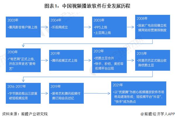 從 2003 年暴風影音客戶端上線起,中國視頻播放軟件行業發展至今已有近 20 年歷程,經歷了從市場開拓、市場混戰、市場逐漸穩定三大階段。2008 年,國家廣電總局確立視頻網站經營牌照制度,我國視頻播放軟件行業逐漸走向規范化發展道路。2021 年,中國視頻播放軟件行業以 " 優愛騰 " 為核心視頻播放軟件市場格局逐漸形成 ; 短視頻平臺 " 抖音 "、" 快手 " 異軍突起,成為當下熱點。