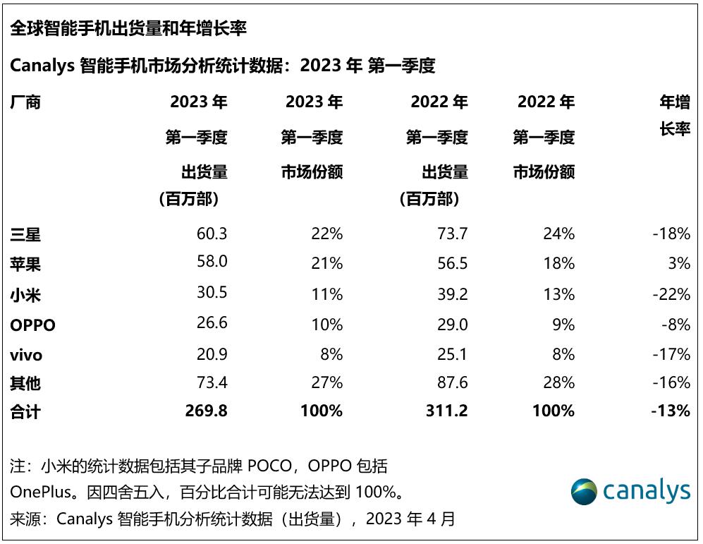 2023 年第一季度全球智能手機出貨量下降 13%,跌至 2.70 億部。雖然 2022 年第一季度和 2023 年第一季度的出貨量差異仍然較為明顯,但需求的下滑已開始趨于平穩。得益于新品發布,三星重奪領先位置,出貨量達到 6030 萬部。蘋果公司以 5800 萬部的出貨量位居第二。排名前五的廠商中,只有蘋果實現了同比增長,取得了高達 21% 的市場份額。小米以 3050 萬部的出貨量捍衛了其第三名的位置,而 OPPO 和 vivo 分別以 2660 萬和 2090 萬部的出貨量躋身前五,分別占據 10% 和 8% 的市場份額。