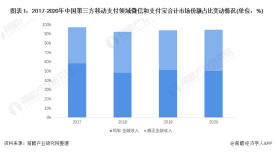 我國第三方移動支付的競爭格局基本保持穩(wěn)定,支付寶和微信常年占據(jù)行業(yè)龍頭地位,市場份額占比合計保持在 90% 以上。根據(jù)易觀數(shù)據(jù),2020 年在第三地方移動支付領(lǐng)域,微信和支付寶合計市場份額為 94.4%。根據(jù)螞蟻金服和騰訊在金融服務(wù)領(lǐng)域收入規(guī)模,前瞻估測 2017-2020 年螞蟻金服在中國第三方移動支付領(lǐng)域市場份額超過 50%,略高于騰訊系。