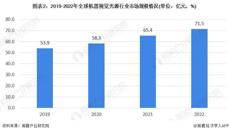 從市場發展來看,機器視覺光源行業是機器視覺技術中的重要組成部分,其市場規模快速增長。從全球機器視覺光源的市場規模變化情況來看,隨著機器視覺的廣泛應用,機器視覺光源的規模也在不斷提升。根據機器視覺光源在機器視覺系統中的成本占比來看,2019-2022 年全球機器視覺光源市場規模逐年增長,2022 年增長至 71.5 億元,同比增長了 9.3%。