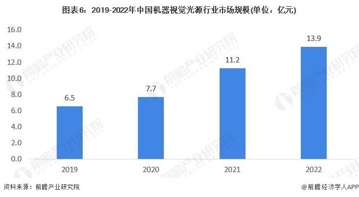 隨著中國制造業的轉型升級,機器視覺光源在中國市場得到了廣泛應用。從中國的市場規模發展情況來看,根據測算,2019-2022 年,中國機器視覺光源行業的市場規模逐年增長,2022 年增長至 13.9 億元。