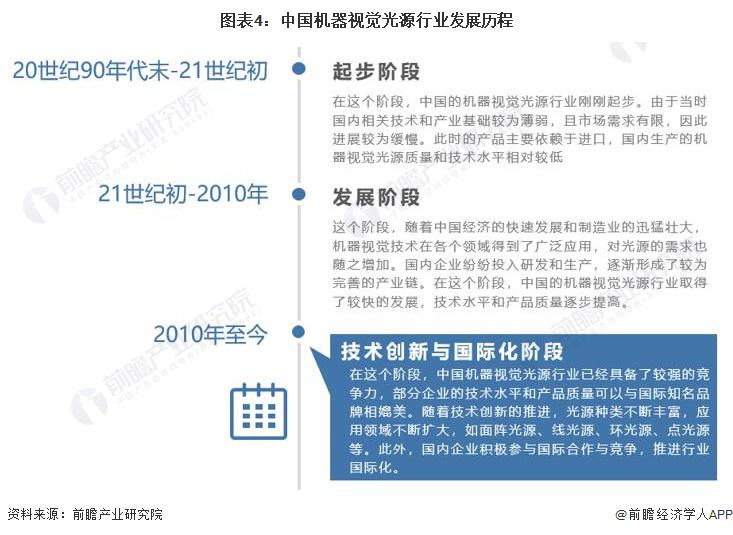 中國機器視覺光源行業的發展歷程可以概括為三個階段,整體來看,中國機器視覺光源行業經歷了從起步到發展壯大再到技術創新與國際化的過程,目前已經具備較強的競爭力,中低端產品基本實現了國產化替代。在未來的發展中,隨著人工智能、智能制造等領域的快速發展,機器視覺光源行業有望在技術創新、產品質量和應用領域等方面取得更大突破。