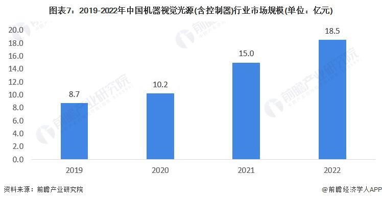 2019-2022 年,中國機器視覺光源 ( 含控制器 ) 行業的市場規模逐年增長,2022 年增長至 18.5 億元。