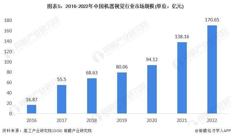 隨著工業自動化技術不斷走向成熟,對于物體檢測、增強分析、監控容差和準確的組件測量等能力要求也逐漸提升,越來越多的制造企業開始采用機器視覺系統來實現生產過程中檢查、測量和自動識別等功能的優化。目前,中國正成為世界機器視覺發展最活躍的地區之一,應用范圍幾乎涵蓋國民經濟各個領域,其中工業領域是機器視覺應用比重最大的領域,重要原因是中國已經成為全球制造業的加工中心,高要求的零部件加工及其相應的先進生產線,使許多國際先進水平的機器視覺系統和應用經驗也進入中國。最具代表性的是消費類電子產品應用,如手機、電腦等產品組裝生產過程中的尺寸檢測、缺陷檢測、定位引導等。與此同時,機器視覺產品的應用范圍也逐步擴大,由起初的半導體和消費電子行業,擴展到汽車制造、光伏半導體等領域,在交通、機器人等行業也有大量應用,進一步增加了機器視覺行業的市場空間。根據 GGII 公布的數據,2022 年中國機器視覺行業市場規模達到 170.65 億元,同比增長 23.5%。