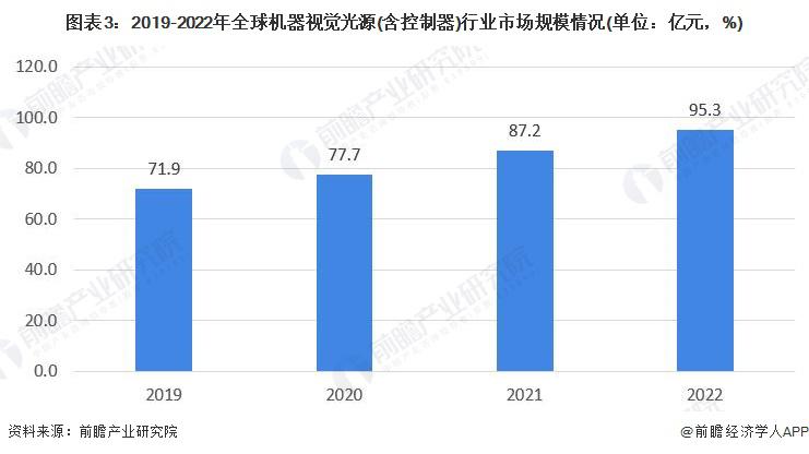 根據機器視覺光源 ( 含控制器 ) 在機器視覺系統中的成本占比來看,2019-2022 年全球機器視覺光源 ( 含控制器 ) 市場規模逐年增長,2022 年增長至 95.3 億元。