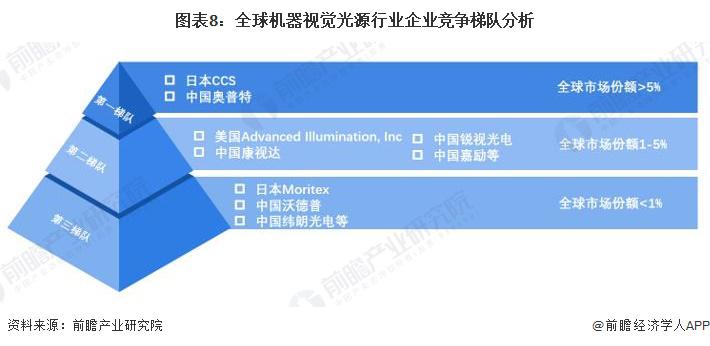 從市場競爭梯隊來看,以代表企業占據全球市場份額為依據進行分類,第一梯隊主要為市場份額大于 5% 的企業,其中以日本 CCS 為代表,其全球市場份額達到 10% 以上 ; 隨著中國市場在全球市場占比的不斷提升,中國龍頭企業奧普特也位于全球市場第一梯隊。第二梯隊的代表企業主要包括美國 Advanced Illumination, Inc、中國銳視光電、中國康視達、中國嘉勵等企業,其市場份額位于 1%-5% 之間。第三梯隊主要為機器視覺光源業務占比較小或企業整體市場規模較小的企業,以日本 Moritex、中國沃德普和中國緯朗光電等企業為代表,機器視覺光源市場規模不足 1%。