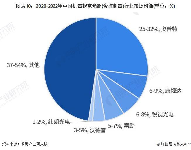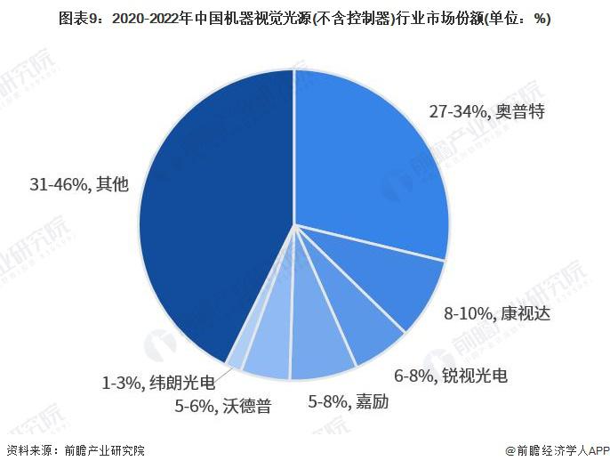 2020-2022 年,由于中國機器視覺光源 ( 不含控制器 ) 國產化替代程度相對較高,機器視覺光源 ( 不含控制器 ) 行業市場的整體競爭格局較為穩定,奧普特作為行業龍頭,其三年的市場份額較高,約 27-34%; 其次為康視達,其三年市場份額約 8-10%; 銳視光電市場份額排名第三,市場份額約 6-8%。此外,上海嘉勵、緯朗光電等企業均在機器視覺光源行業占一席之地。
