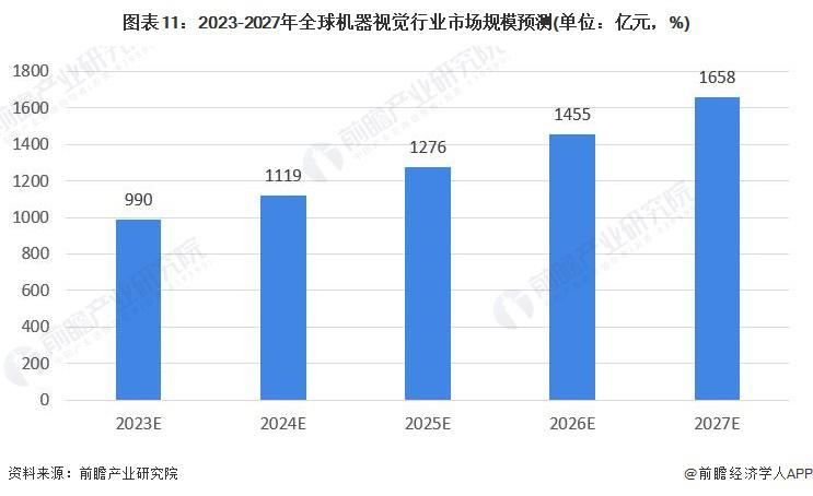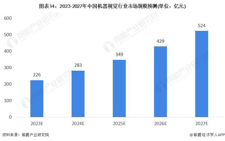 得益于經濟持續穩定的發展、產業結構轉型升級、制造業自動化及智能化進程加速、行業內企業自主研發能力增強、機器視覺產品應用領域的拓寬等因素,預計未來中國機器視覺行業規模將進一步增長,到 2027 年我國機器視覺市場規模將達 524 億元,增長速度領先于全球。