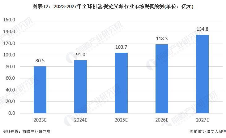 從機器視覺光源的市場規模發展趨勢來看,預計至 2027 年全球機器視覺光源市場規模將達到 134.8 億元。2022 年至 2027 年復合增長率約為 13.5%。