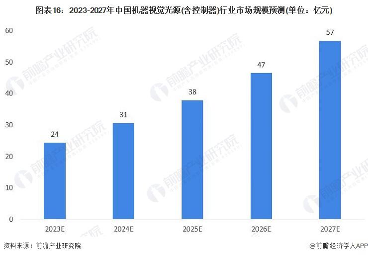預計 2027 年中國機器視覺光源 ( 含控制器 ) 市場規模將達到 57 億元。