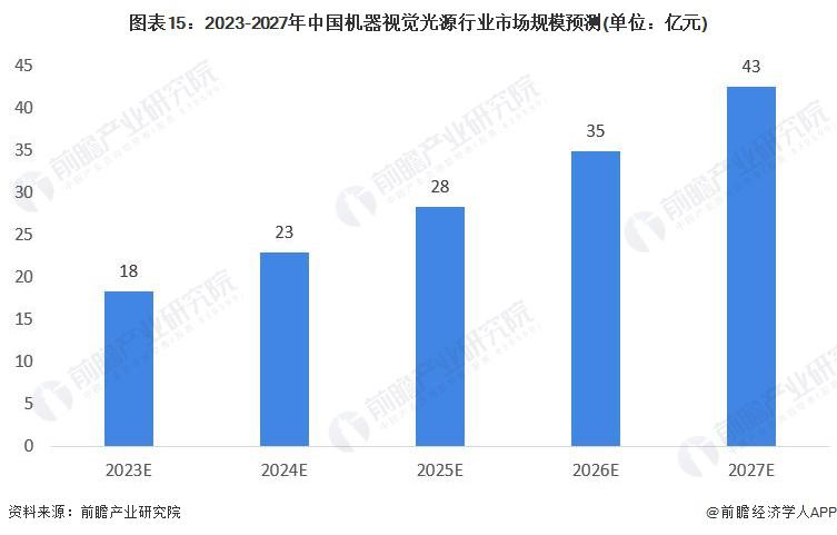 隨著機器視覺系統在工業、醫療等領域的持續滲透,帶動機器視覺光源需求同步增長,預計 2023-2027 年中國機器視覺光源將以 23% 的 CAGR 增長,到 2027 年其市場規模將達到 43 億元。