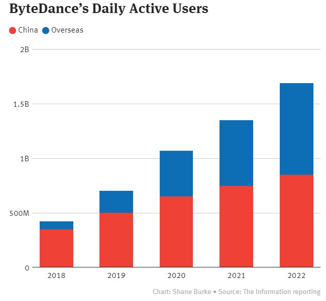 據報道,截至 2022 年底,字節跳動在中國以外的日活用戶已達到 8.4 億,比去年同期增長了 40%,2022 年字節在中國的日活用戶為 8.5 億,同比增長了 13%。