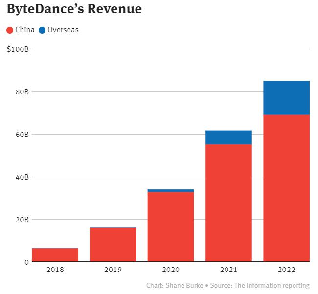 字節跳動的海外收入主要來自 TikTok,也包括視頻游戲和企業軟件等其他的國際業務。該公司 2022 年的海外收入增至 160 億美元,而 2021 年為 65 億美元,2020 年僅為 12 億美元。