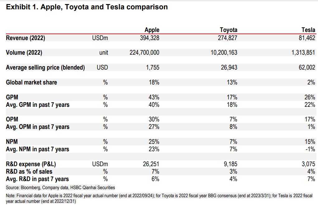 在最佳實踐方面,匯豐以蘋果為智能手機的標桿,以豐田為傳統整車廠的標桿,以特斯拉為智能電動汽車制造商的標桿,將這三家企業的財務數據進行比較: