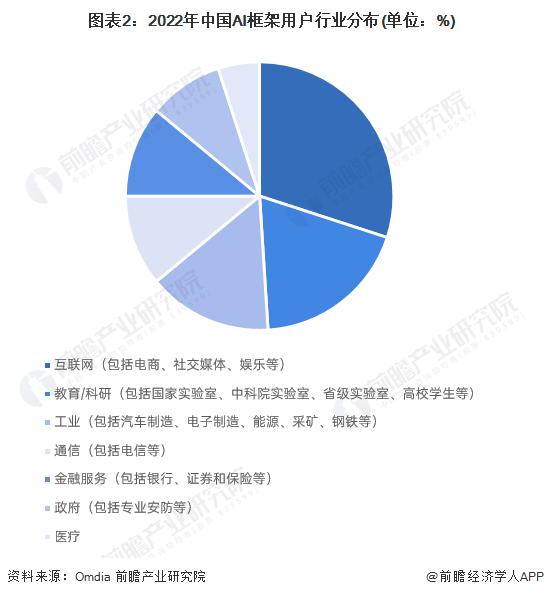 根據 Omdia 的數據,中國 AI 框架用戶主要分布在互聯網、教育 / 科研、工業領域,用戶占比分別為 30%、19% 和 15%。