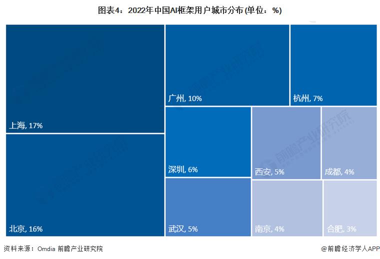 從城市分布來看,北上廣的 AI 框架使用者最多,屬于第一梯隊,三大城市用戶合計占比 43%。第二梯隊的六個城市,杭州、深圳、武漢、西安、成都、南京加起來占了 30%; 在其他城市的開發者相對較少,比較分散。
