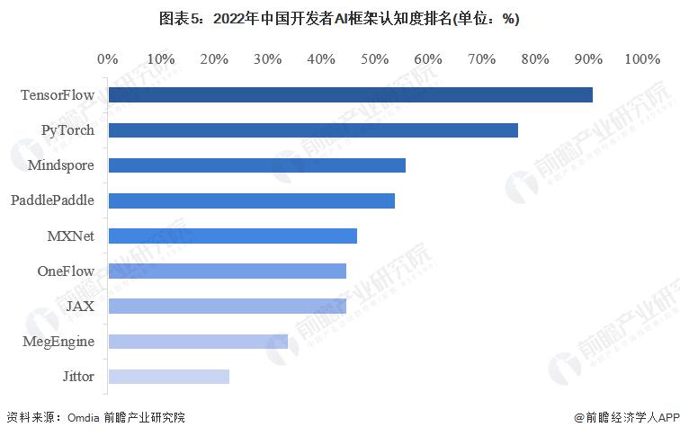 全球領先的人工智能框架 TensorFlow 和 PyTorch 是在中國人工智能開發者中認知度最高的兩大框架,分別排第一和第二。由于 Google 和 Meta 這兩家公司歷史悠久,在互聯網和軟件領域占有重要地位,它們在全球范圍內直接影響著數量可觀的開發者,并直接為各自的開發者社區提供支持,因此認知度較高。