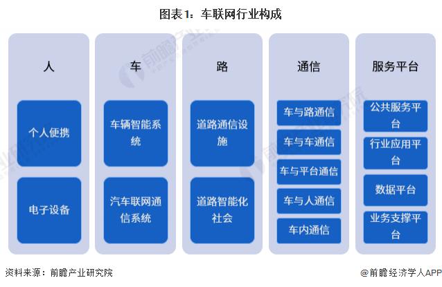 車聯網主要包括人、車、路、通信、服務平臺 5 類要素。" 人 " 是道路環境參與者和車聯網服務使用者 ;" 車 " 是車聯網的核心,主要涉及車輛聯網和智能系統 ;" 路 " 是車聯網業務的重要外部環境之一,主要涉及交通信息化相關設施 ;" 通信 " 是信息交互的載體,打通車內、車際、車路、車云信息流 ;" 服務平臺 " 是實現車聯網服務能力的業務載體、數據載體。