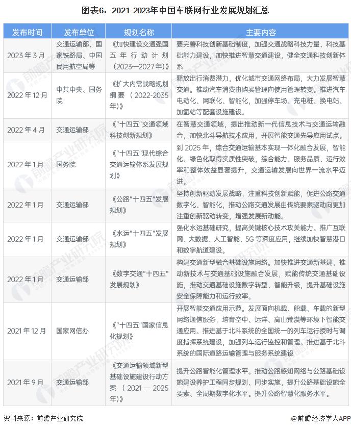 目前,我國車聯網相關政策落腳于相關技術領域的融合布局與協同發展。當前,我國主要進行車聯網與 5G 技術的應用融合,以促進交通運輸、汽車和通信等行業更快實現智能化和數字化。2021 年 6 月發布的《5G 應用 " 揚帆 " 行動計劃 ( 2021-2023 年 ) 》以及 2020 年 9 月發布的《關于擴大戰略性新興產業投資培育壯大新增長點增長極的指導意見》,均對 5G 車聯網未來發展目標進行了詳細規劃。此外,當前我國政策落腳于車路、車車協同技術升級,以支持智能交通,提高駕駛安全和提高交通效率。因此車聯網先導區、路側設施和相關網絡安全標準體系的建設也成為了重要課題。