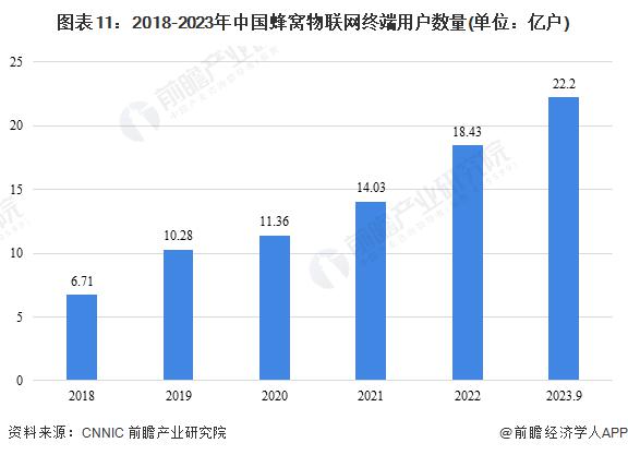 從蜂窩物聯網終端接入用戶數量來看,截至 2022 年年底,我國蜂窩物聯網終端用戶數量達到 18.43 億戶 ; 截至 2023 年前三季度達到了 22.2 億戶,相比 2022 年年底增長了 3.77 億戶。總體來看,我國蜂窩物聯網終端用戶數量增速較快,2018 年至 2022 年,年復合增速約為 28.74%。