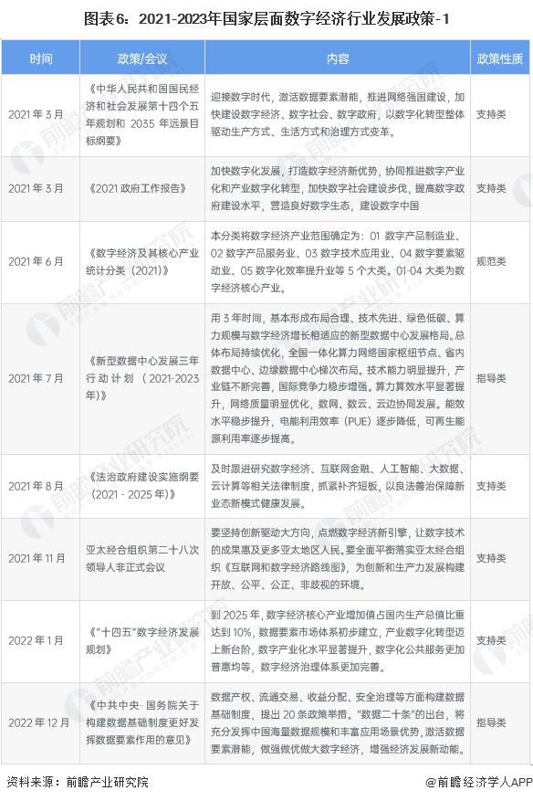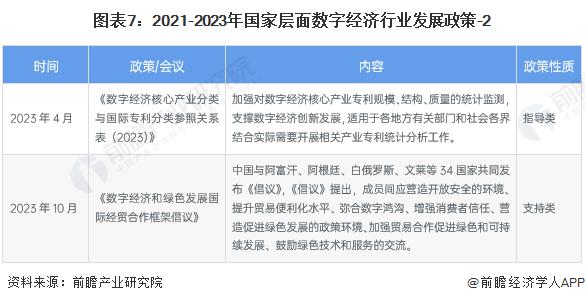 2021 年 3 月,《中華人民共和國國民經濟和社會發展第十四個五年規劃和 2035 年遠景目標綱要》中明確提出:迎接數字時代,激活數據要素潛能,推進網絡強國建設,加快建設數字經濟、數字社會、數字政府,以數字化轉型整體驅動生產方式、生活方式和治理方式變革。2022 年 1 月,《" 十四五 " 數字經濟發展規劃》頒布,提出到 2025 年,數字經濟核心產業增加值占國內生產總值比重達到 10%,數據要素市場體系初步建立,產業數字化轉型邁上新臺階,數字產業化水平顯著提升,數字化公共服務更加普惠均等,數字經濟治理體系更加完善。2023 年,《數字經濟核心產業分類與國際專利分類參照關系表 ( 2023 ) 》以及《數字經濟和綠色發展國際經貿合作框架倡議》發布,數字經濟發展進入國際化階段。