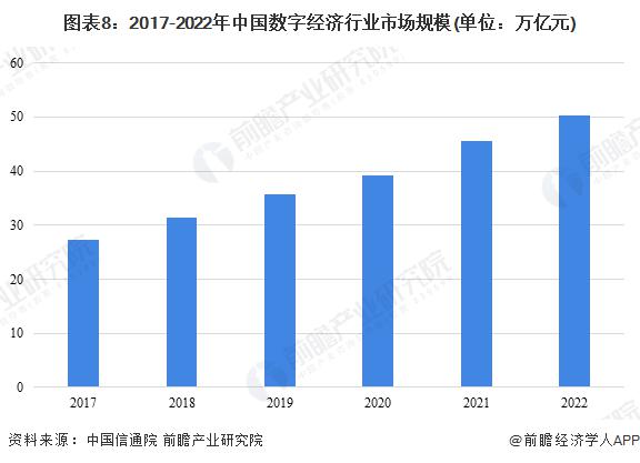 2017 年至 2022 年,我國數字經濟行業市場規模持續增長,2022 年首次突破 50 萬億元,達到 50.2 萬億元。2017 年至 2022 年,我國數字經濟行業市場規模總共增長了 23 萬億元,將近翻倍。總體來看,我國數字經濟行業整體發展潛力較大,行業擁有較大的發展空間。