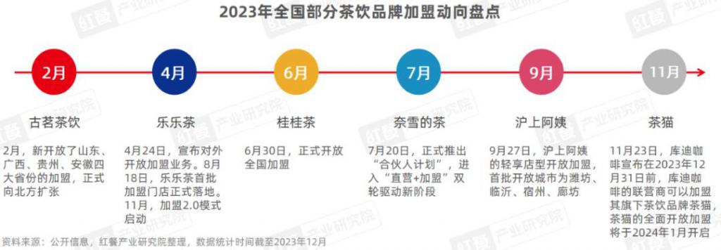 據紅餐產業研究院不完全統計,2023年,傳出加盟新消息的茶飲品牌共計5家,其中奈雪的茶在7月正式開放加盟。茶飲品牌集體開放加盟,反映的是品牌低成本快速擴張的迫切發展需要。