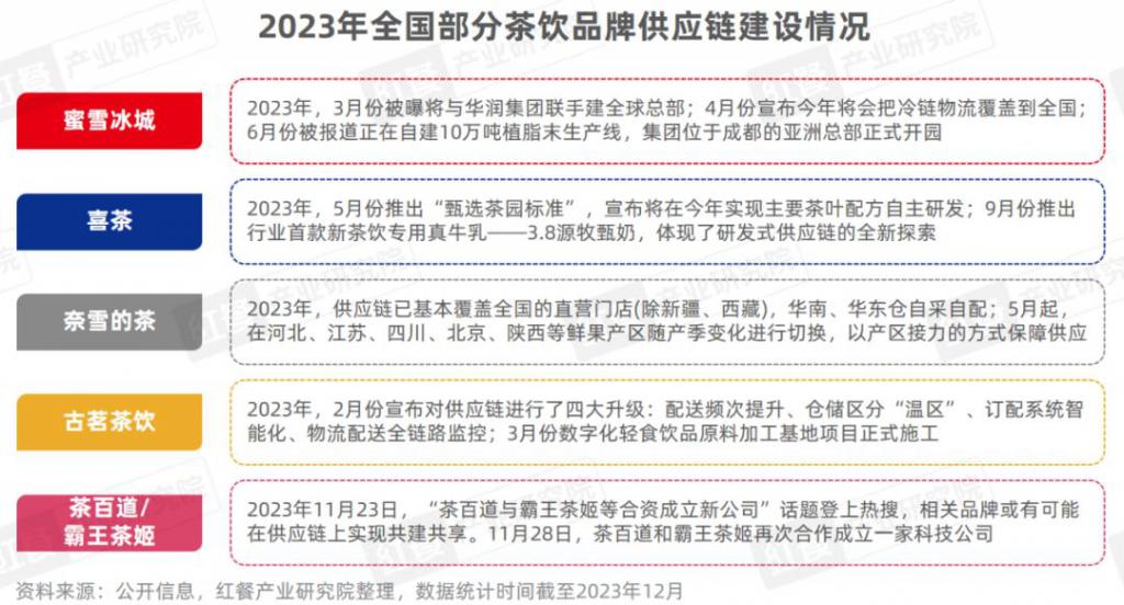 2023年,茶飲品牌加強供應鏈建設,蜜雪冰城、奈雪的茶、古茗茶飲等品牌都在進一步夯實自身供應鏈。在茶飲賽道競爭愈發激烈的當下,供應鏈體系建設是品牌降本增效、賦能擴張的可行之策。