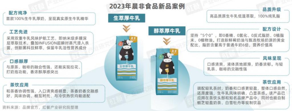2023年,晨非食品抓住茶飲奶基底升級新風口,推出"生萃厚牛乳""醇萃厚牛乳"等創新乳品,從原料端踐行了茶飲配方純凈、產品健康的升級理念。
