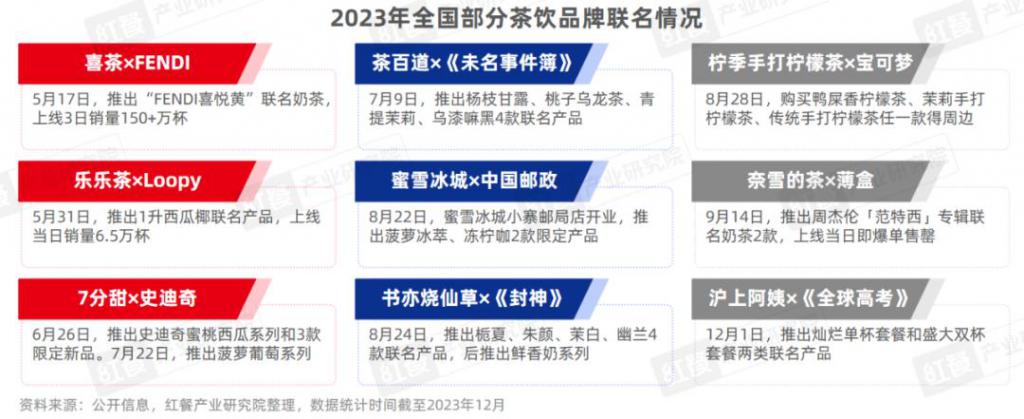 據紅餐產業研究院此前發布的《飲品品牌聯名營銷觀察報告2023》,2023年前三季度,18個樣本現制飲品品牌的聯名營銷事件總次數達到236次。并且,在2024年第四季度中,茶飲界的聯名營銷再出新模范。