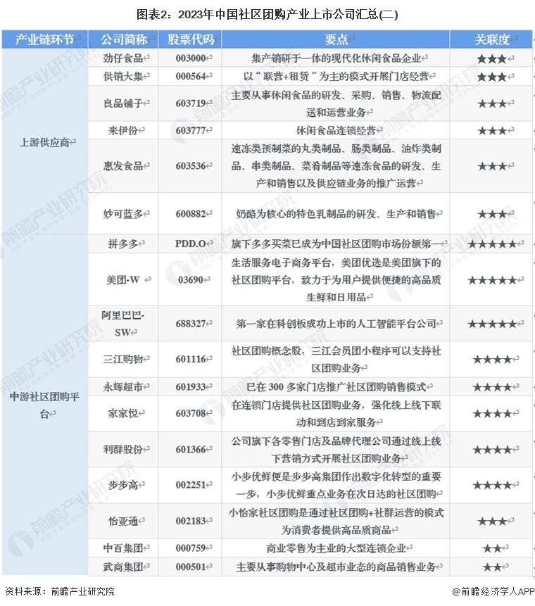 社區團購產業的上市企業分布在上游供應商和中游社區團購平臺。上游主要有國聯水產 ( 300094 ) 、茶花股份 ( 603615 ) 、宏輝果蔬 ( 603336 ) 、煌上煌 ( 002695 ) 等企業 ; 中游主要有拼多多 ( PDD.O ) 、美團 -W ( 03690 ) 、阿里巴巴 -SW ( 688327 ) 等企業。具體上市公司信息如下: