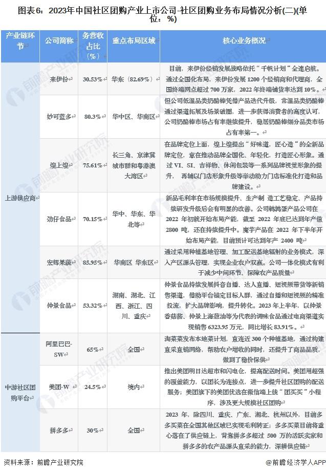 從業務布局來看,核心業務占比方面,國聯水產 ( 300094 ) 、妙可藍多 ( 600882 ) 、宏輝果蔬 ( 603336 ) 等企業均在 80% 以上,表明上述企業的業務較為集中 ; 重點布局區域方面,安井食品 ( 603345 ) 、來伊份 ( 603777 ) 業務布局集中在華東區域 ; 核心業務概況方面,多家上市企業具有自身的社區團購平臺。