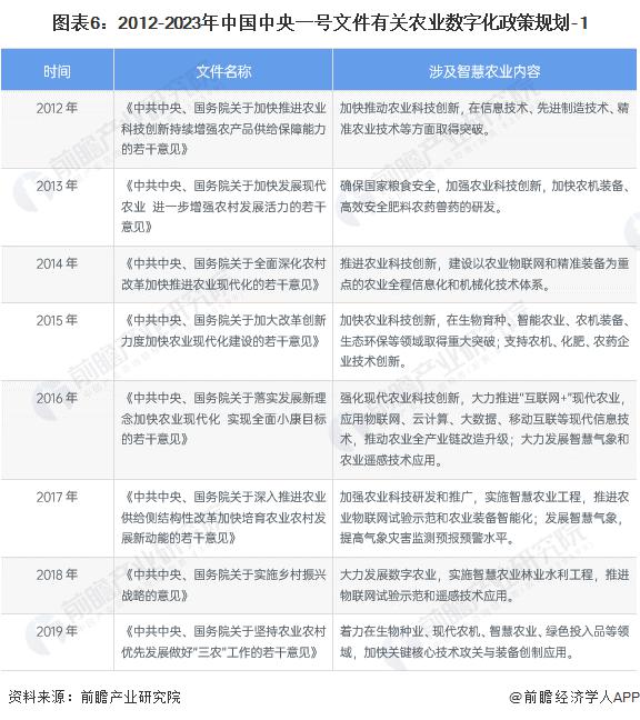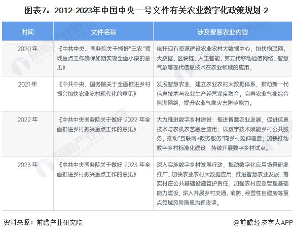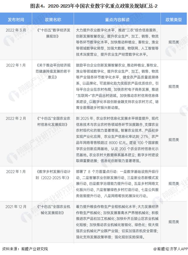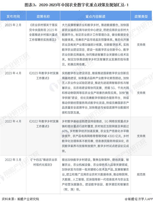 2020 年以來,國家政府不斷出臺政策支持我國農業數字化,2020 年《關于抓好 " 三農 " 領域重點工作確保如期實現全面小康的意見》中提出加快物聯網、大數據、區塊鏈、人工智能、5G 通信網絡、智慧氣象等現代信息技術在農業領域的應用。2023 年,《農業農村部關于落實黨中央國務院 2023 年全面推進鄉村振興重點工作部署的實施意見》中提出實施數字農業建設項目,建設一批數字農業創新中心、數字農業創新應用基地。