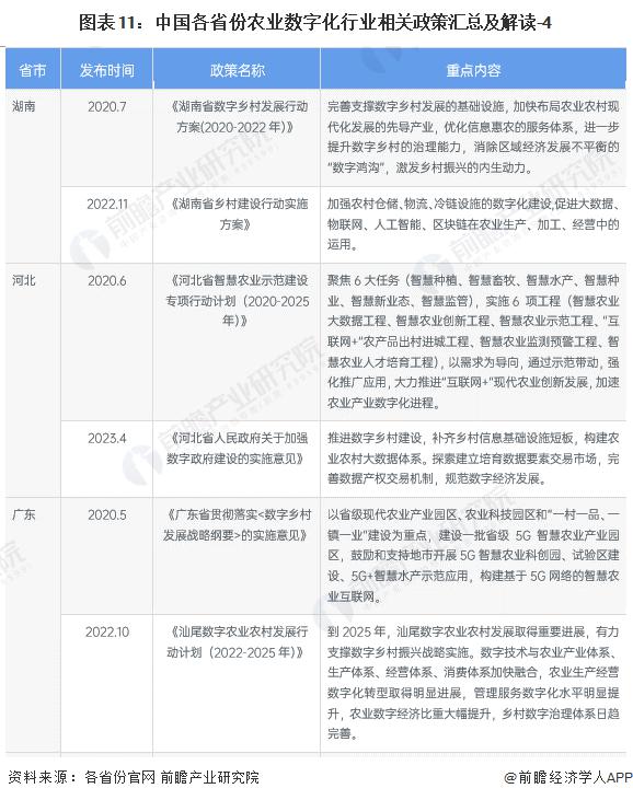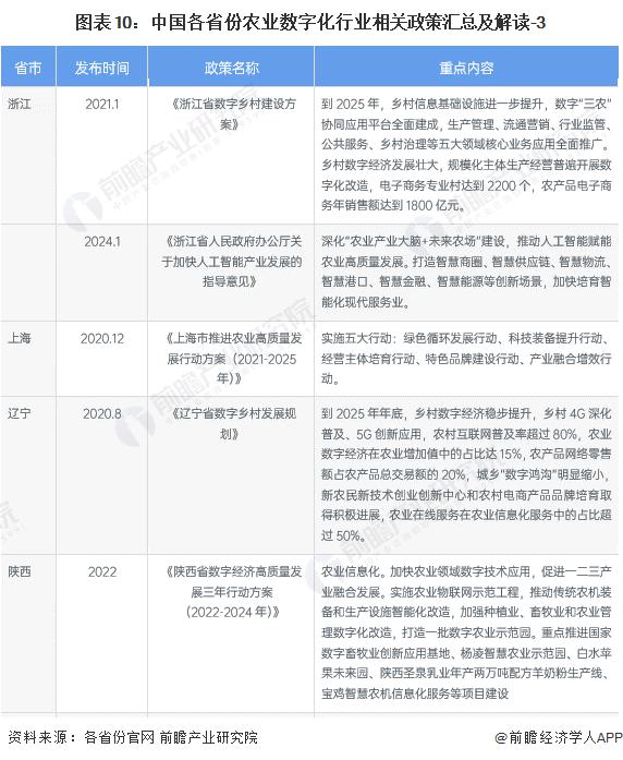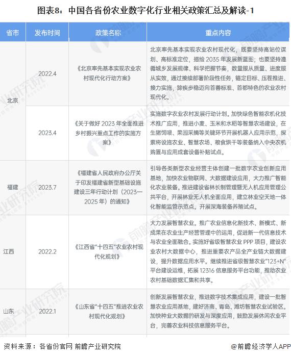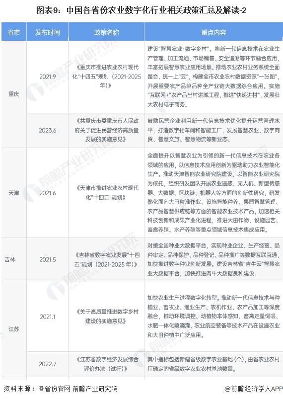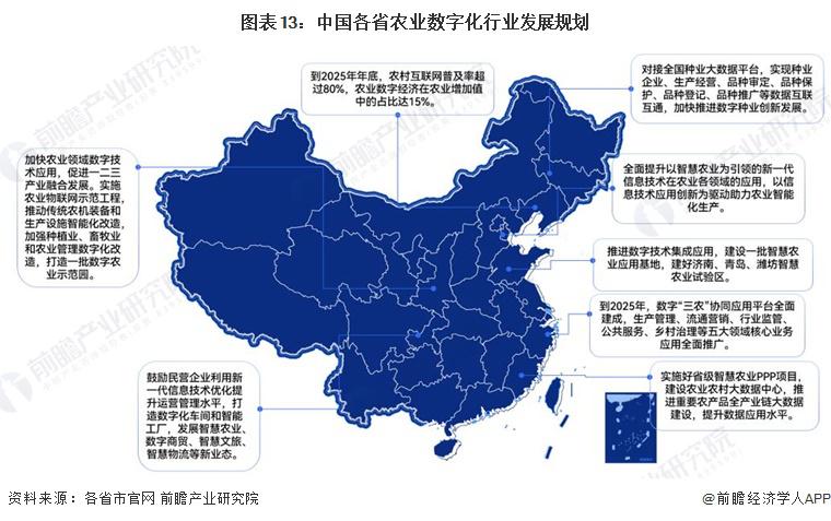 " 十四五 " 期間,我國大部分省份都提出了有關農業數字化行業的發展規劃。例如遼寧省規劃到 2025 年年底,農村互聯網普及率超過 80%,農業數字經濟在農業增加值中的占比達 15%。浙江省提出到 2025 年,數字 " 三農 " 協同應用平臺全面建成,生產管理、流通營銷、行業監管、公共服務、鄉村治理等五大領域核心業務應用全面推廣。