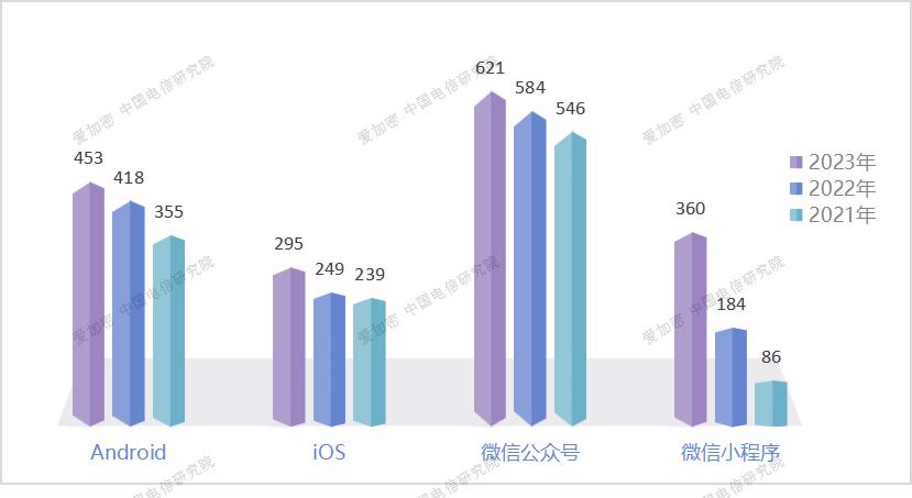 截至 2023 年,移動(dòng)應(yīng)用安全大數(shù)據(jù)平臺(tái)收錄全國 Android 應(yīng)用共計(jì) 453 萬款,iOS 應(yīng)用共計(jì) 295 萬款,微信公眾號(hào) 621 萬個(gè),微信小程序 360 萬個(gè)。2023 年年度,全國總計(jì)更新及新上架的應(yīng)用共計(jì) 27 萬款。