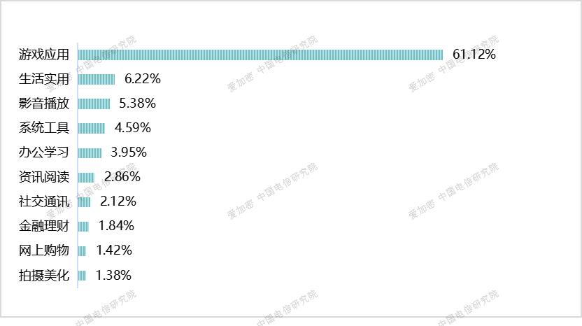 截至到 2023 年 12 月 31 日,全國活躍應(yīng)用總計(jì) 7 萬款。從功能類型來看,游戲類應(yīng)用活躍度較高,占全國活躍應(yīng)用總量的 27%,位居第一,近三年對(duì)比,游戲應(yīng)用遠(yuǎn)低于以往兩年;生活實(shí)用類應(yīng)用數(shù)量占全國活躍應(yīng)用的 16%,位居第二;辦公學(xué)習(xí)類應(yīng)用數(shù)量占全國活躍應(yīng)用的 12%,位居第三。