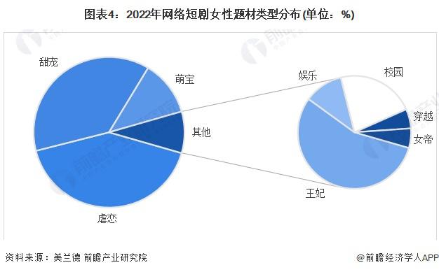 網絡短劇中女性用戶是較大的受眾群體,其中虐戀題材占比高達 42%,甜寵題材達 38%,是網絡短劇常見題材。萌寶占比 12%,其他題材占比低于 5%。