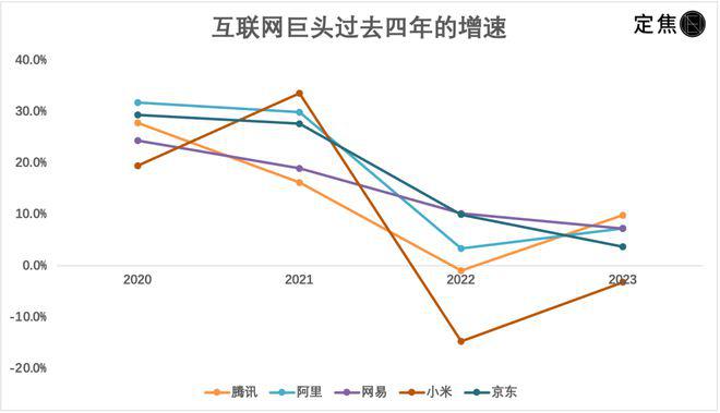 過去兩年,很多行業(yè)都感覺增長困難,互聯(lián)網(wǎng)也不例外。2023 年,騰訊、阿里、網(wǎng)易、京東、百度的增速都只有個位數(shù),小米是負(fù)增長。