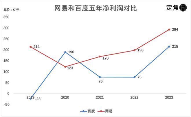 網(wǎng)易是唯一一個跟 BAT 屬于同時代,每年都很賺錢,市值還排在前五的互聯(lián)網(wǎng)巨頭。2023 年網(wǎng)易的凈利潤是 294 億元,雖然比不上騰訊、阿里、拼多多,但盈利很穩(wěn)定。把網(wǎng)易過去五年的凈利潤數(shù)據(jù)拉出來,平均數(shù)是 200 億元。