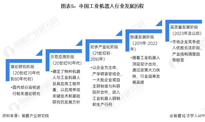 我國的工業機器人研究開始于 20 世紀 70 年代,大體可分為 5 個階段,即理論研究階段、示范應用階段、初步產業化階段、快速發展階段、高質量發展階段。
